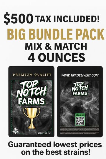 Get the best deal in the Bay with our Mix & Match Big Bundle Pack! Choose any 4 ounces of premium Top Notch Farms flower for just $500 flat – tax included.
